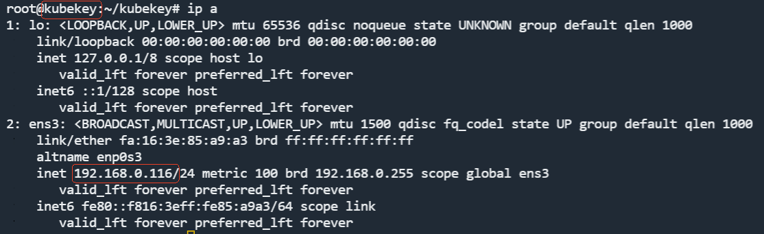 由于我们只有一个节点(一台服务器),因此 hosts 列表中只保留一条就可以,然后将 name 改为服务器的 hostname,ip 地址改为内网地址,user 改为 root,密码填成你自己的 root 用户的密码。那么如何查看 hostname 和 ip呢?如下图所示,执行 ip a。