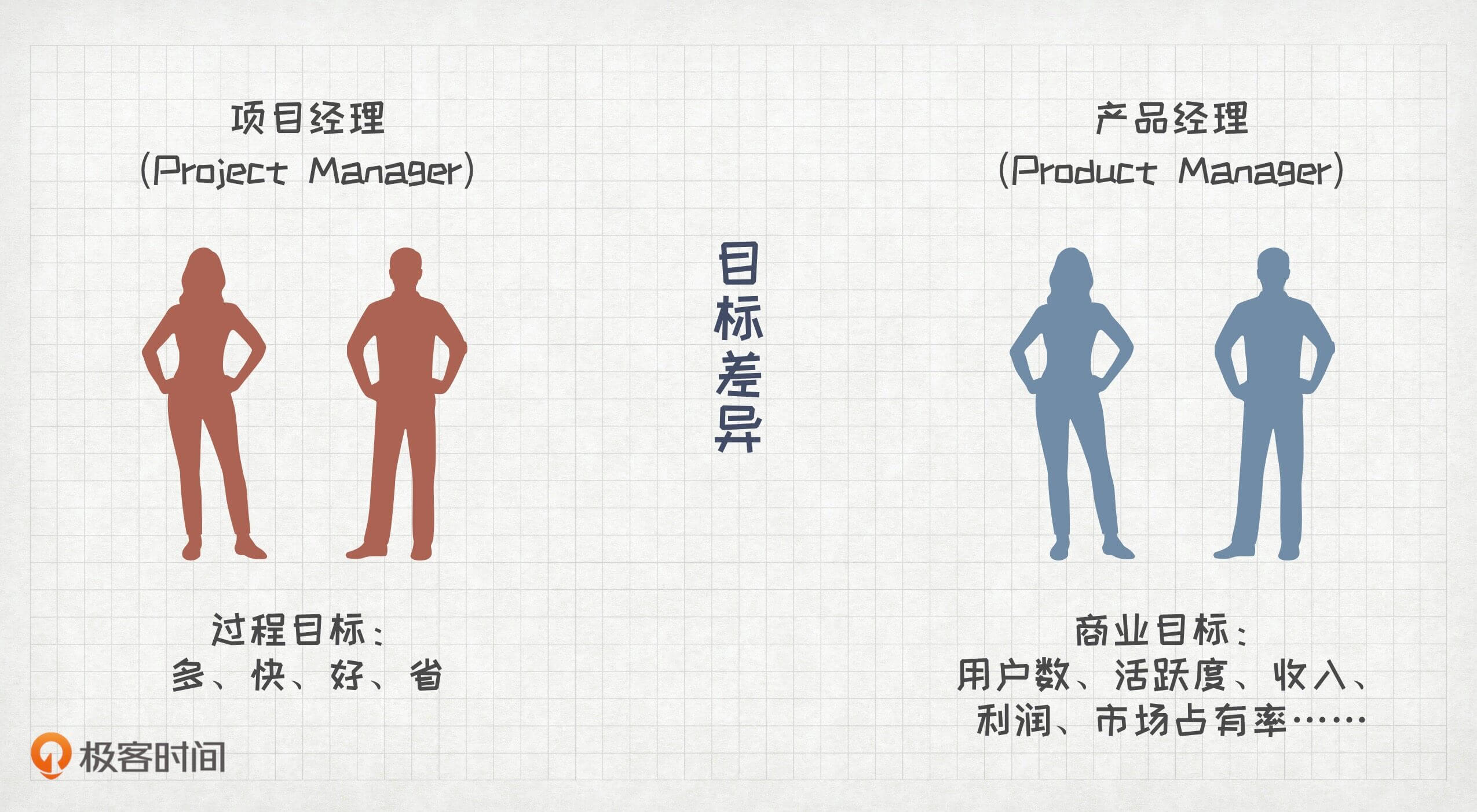 项目经理和产品经理最根本的差异其实就是目标的差异。项目经理通常强调完成任务,追求的目标可以用“多快好省”这个词来概括——多,是希望项目范围尽量大;快,是希望项目周期尽量短;好,是希望项目质量尽量高;省,是希望资源消耗尽量少。这些目标,其实都是偏完成度相关的,很少涉及商业方面的考虑。