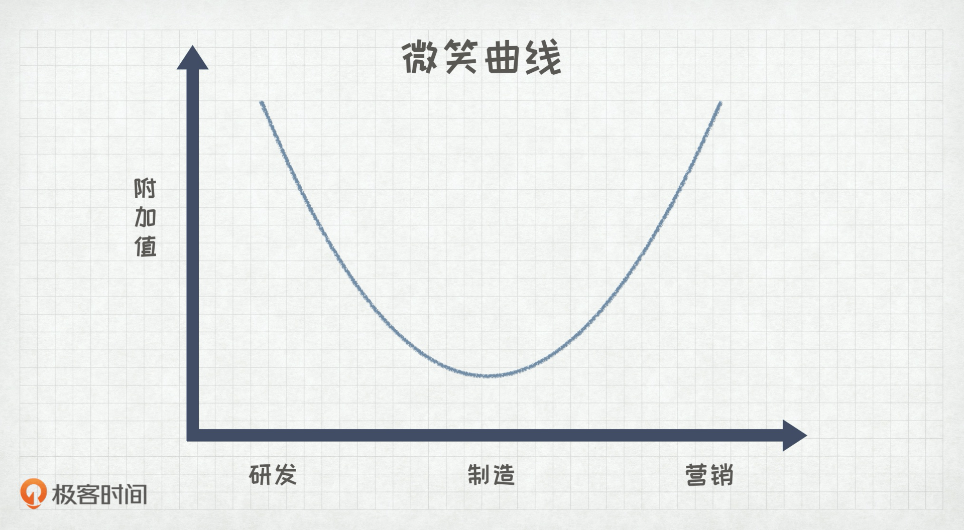 宏碁集团创办人施振荣先生提出过微笑曲线,提出在产品从无到有的全过程中,两种事情对结果的附加价值最高,一是前期的研发设计,二是后期的品牌营销。