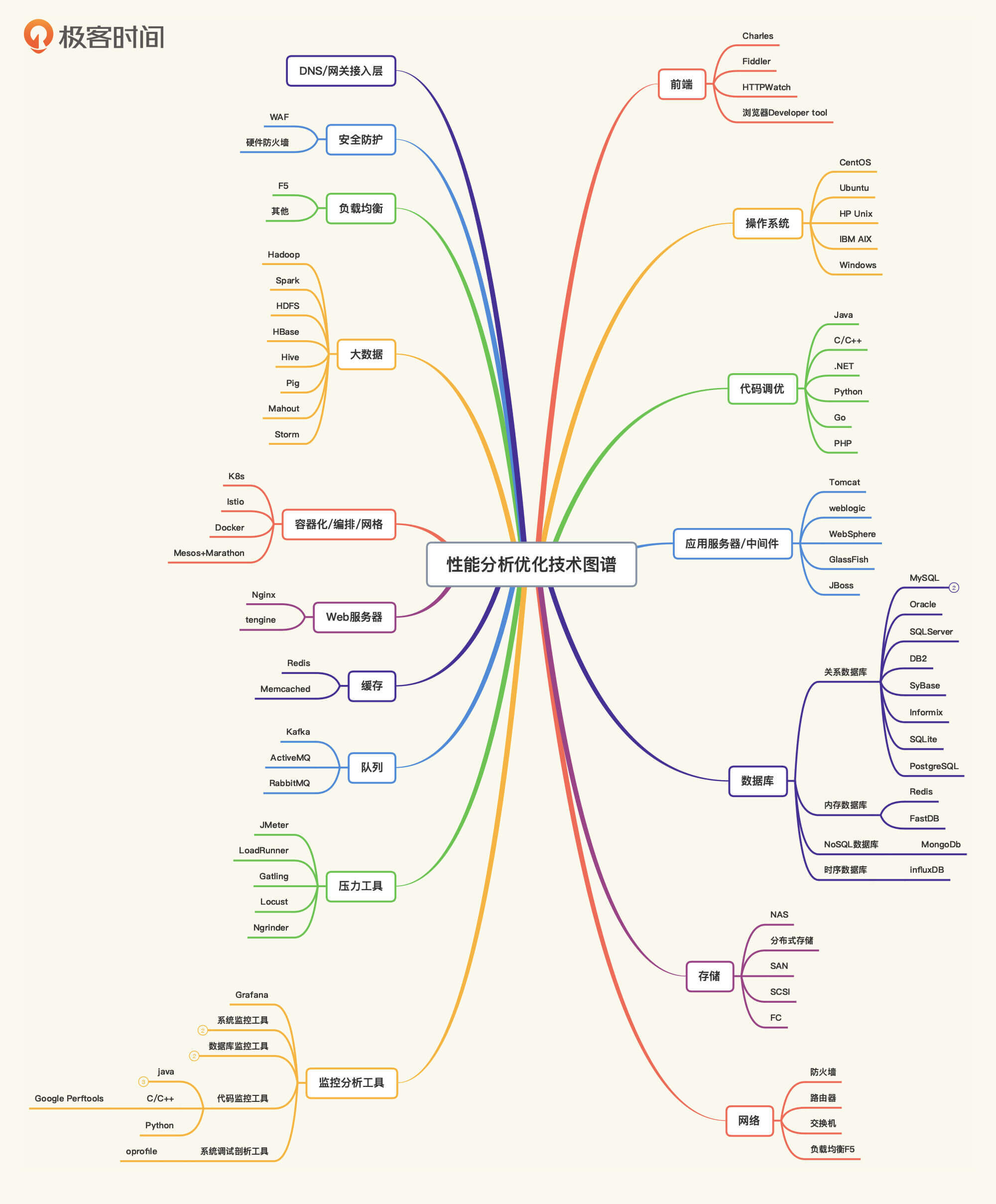 我不知道你在冒出这个想法之前,有没有做过尝试和努力。其实,你只要在这个图谱中任选一个模块,然后再挑选其中一个技术组件,把它吃透,其他相似的技术组件大多能触类旁通。因为我们的重点是掌握背后的性能分析逻辑,而不是学会使用所有的工具。