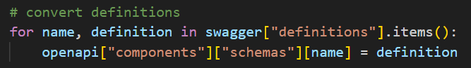 最后,就是处理 components 部分了,需要从 Swagger 文档的 definitions 转换成 components。好在其内部结构都是一样的,因此可以直接拷贝。代码如下: