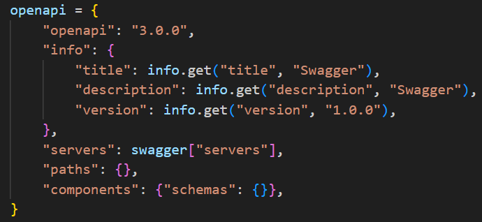 回到代码中,Swagger 转 OpenAPI 的代码逻辑,比较易懂,简单看一下。首先定义了一个如下图所示的非常简洁的 OpenAPI 的格式。