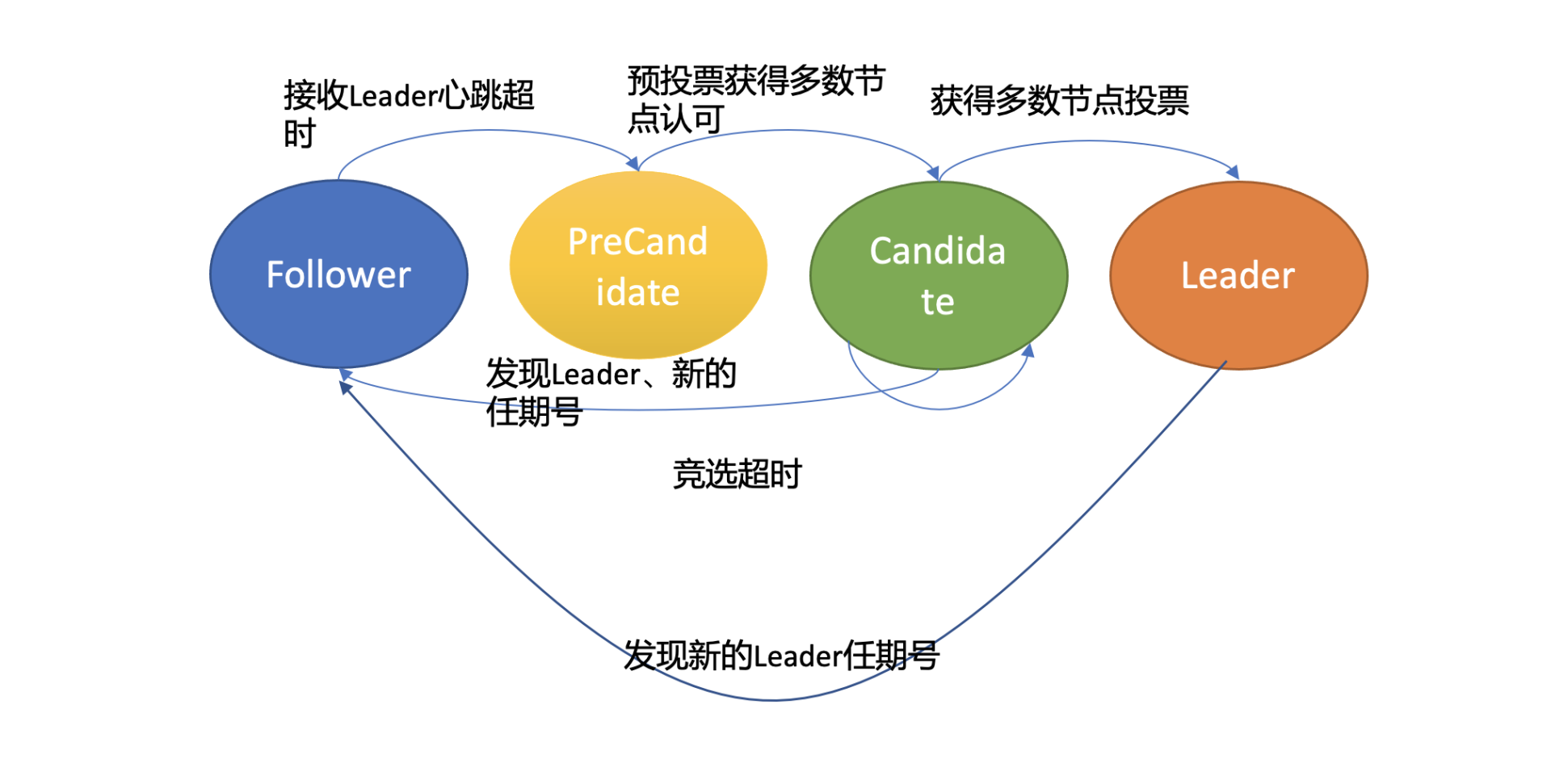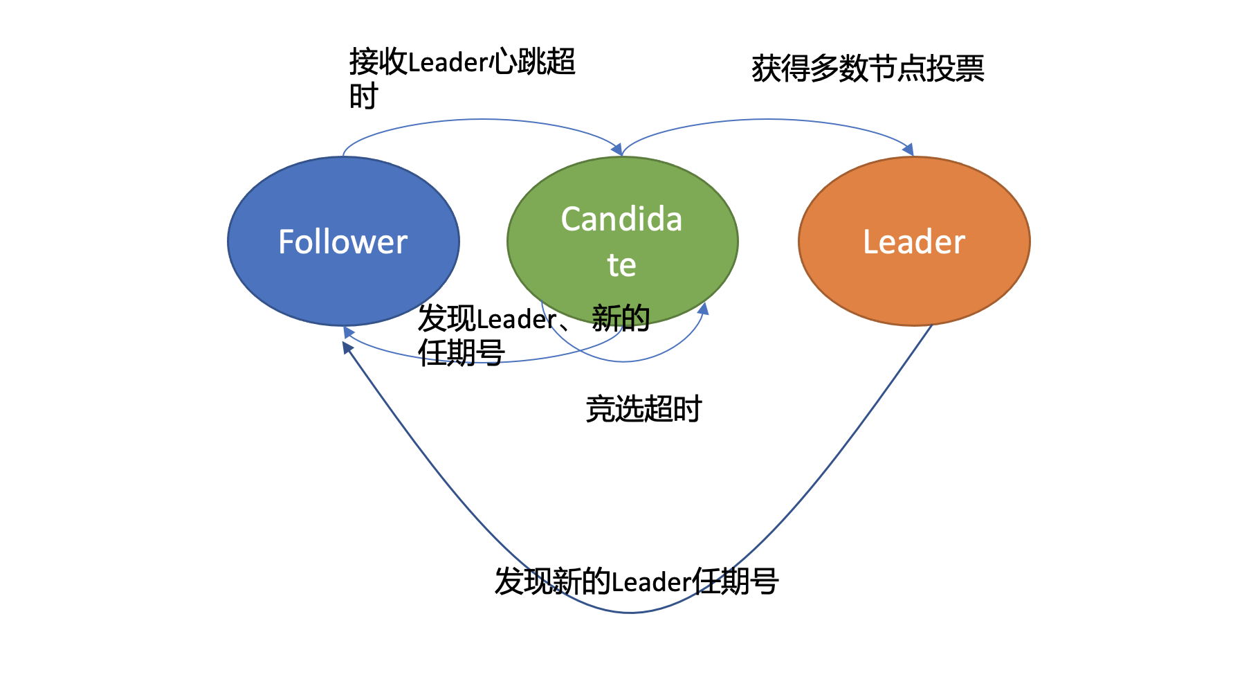 上图是节点状态变化关系图,当Follower节点接收Leader节点心跳消息超时后,它会转变成Candidate节点,并可发起竞选Leader投票,若获得集群多数节点的支持后,它就可转变成Leader节点。