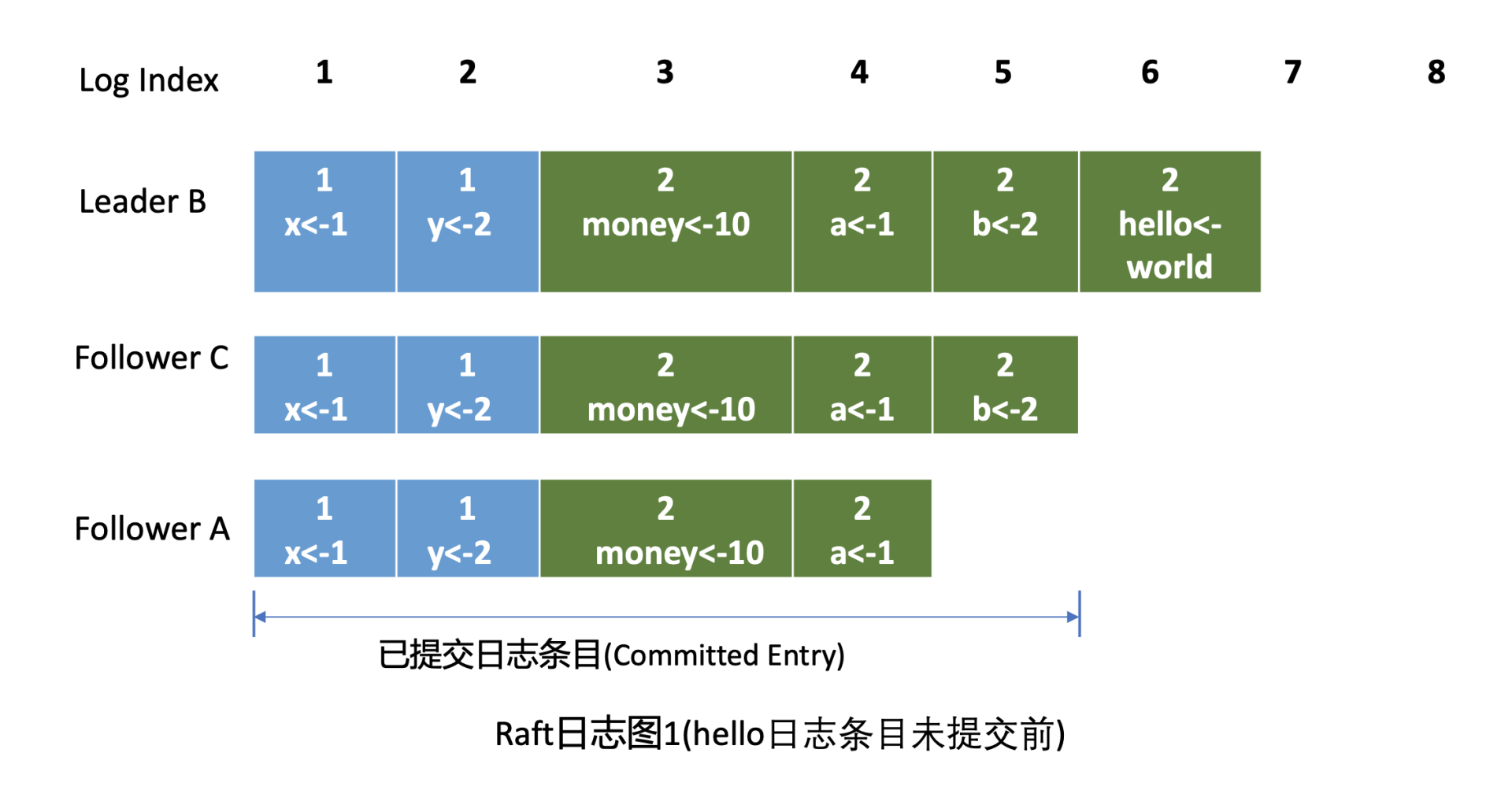 日志图1描述的是hello日志条目未提交前的各节点Raft日志状态。