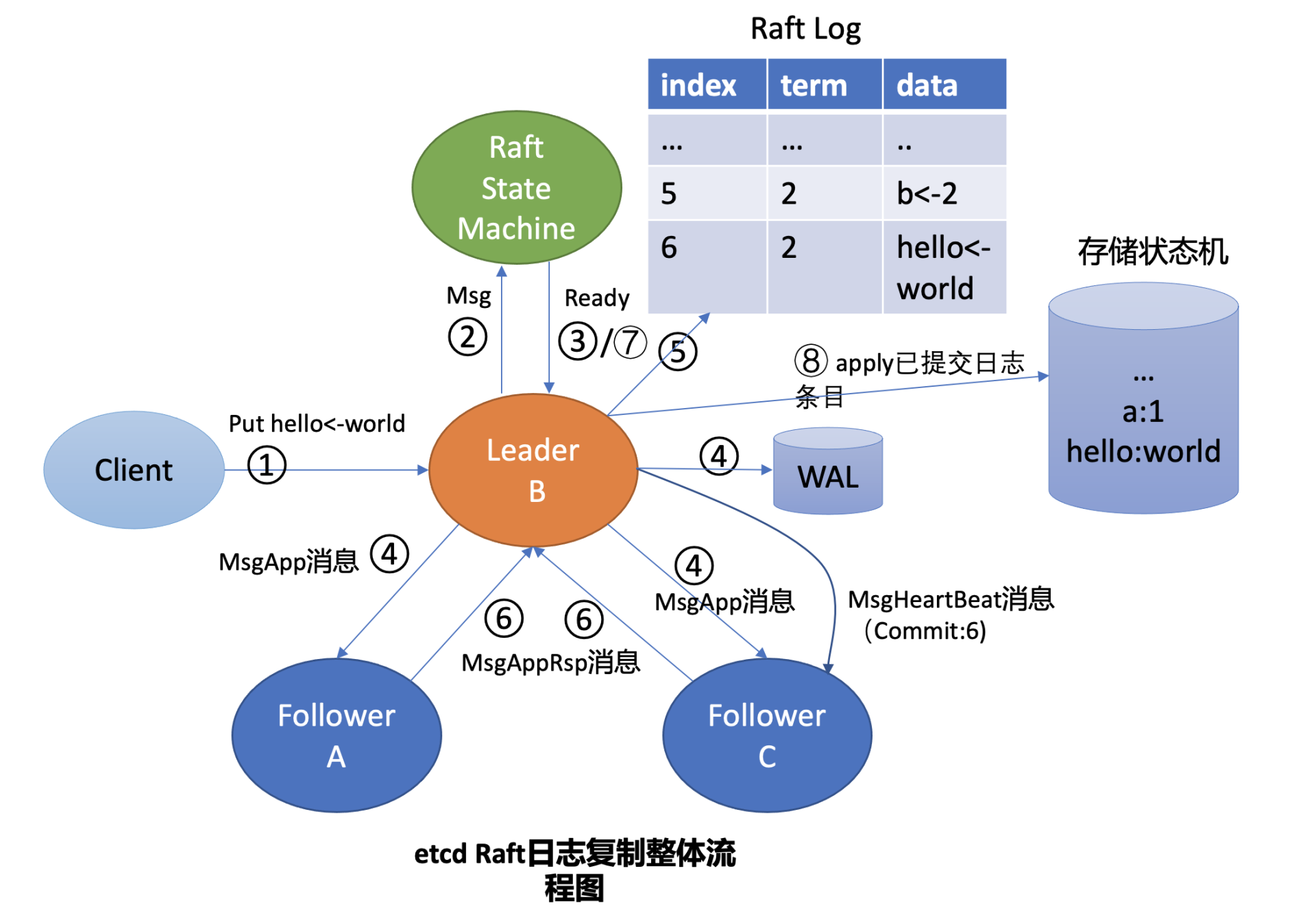 首先Leader收到client的请求后,etcdserver的KV模块会向Raft模块提交一个put hello为world提案消息(流程图中的序号2流程), 它的消息类型是MsgProp。
