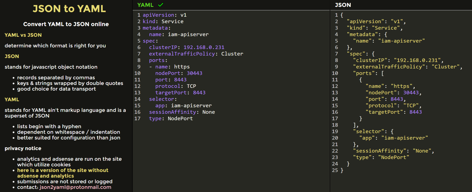 我就是通过json2yaml在线工具,来转换YAML和JSON的,如下图所示: