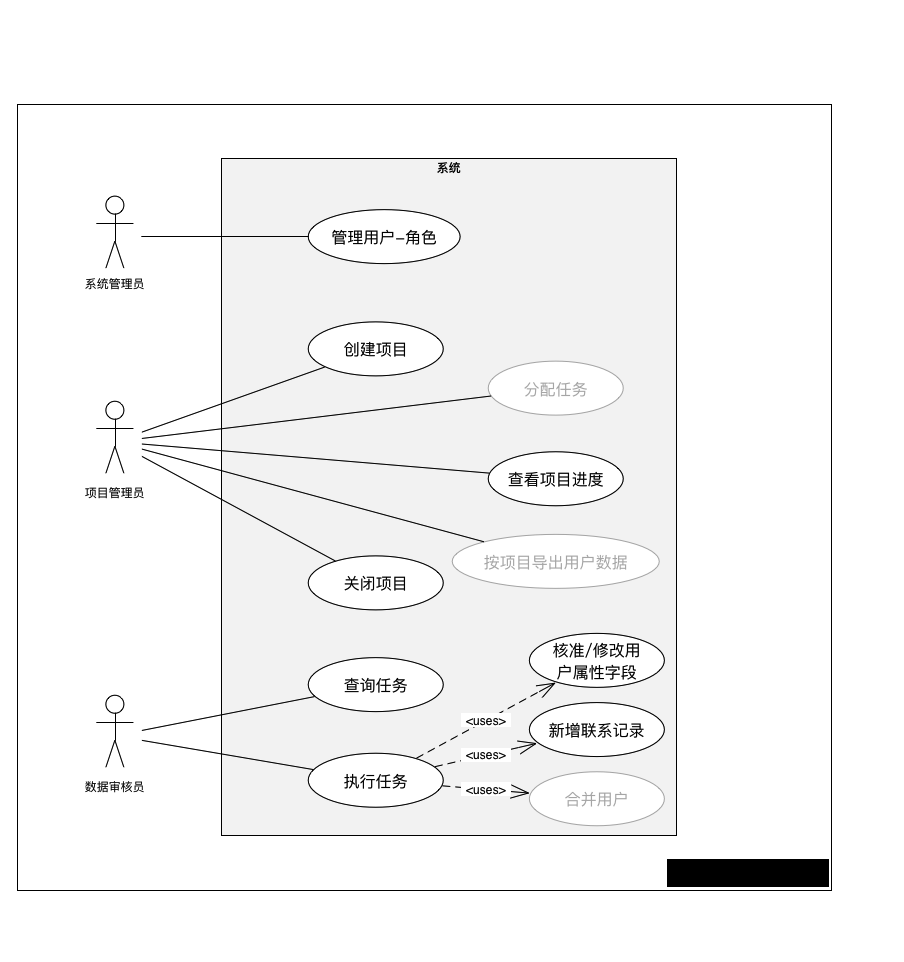 用例图的一个老大难问题是区分用例的粒度,这是个没有唯一答案的问题,同一个人的用力粒度划分标准可能都不同。比如 CRUD (创建、读取、更新、删除)算一个用例,还是四个用例。比如“账户管理”算是一个用例,还是“账户创建”“角色分配”“账户删除”“账户查询”四个用例。这简直是个哲学问题,这么多年我也没能找到一个金标准。