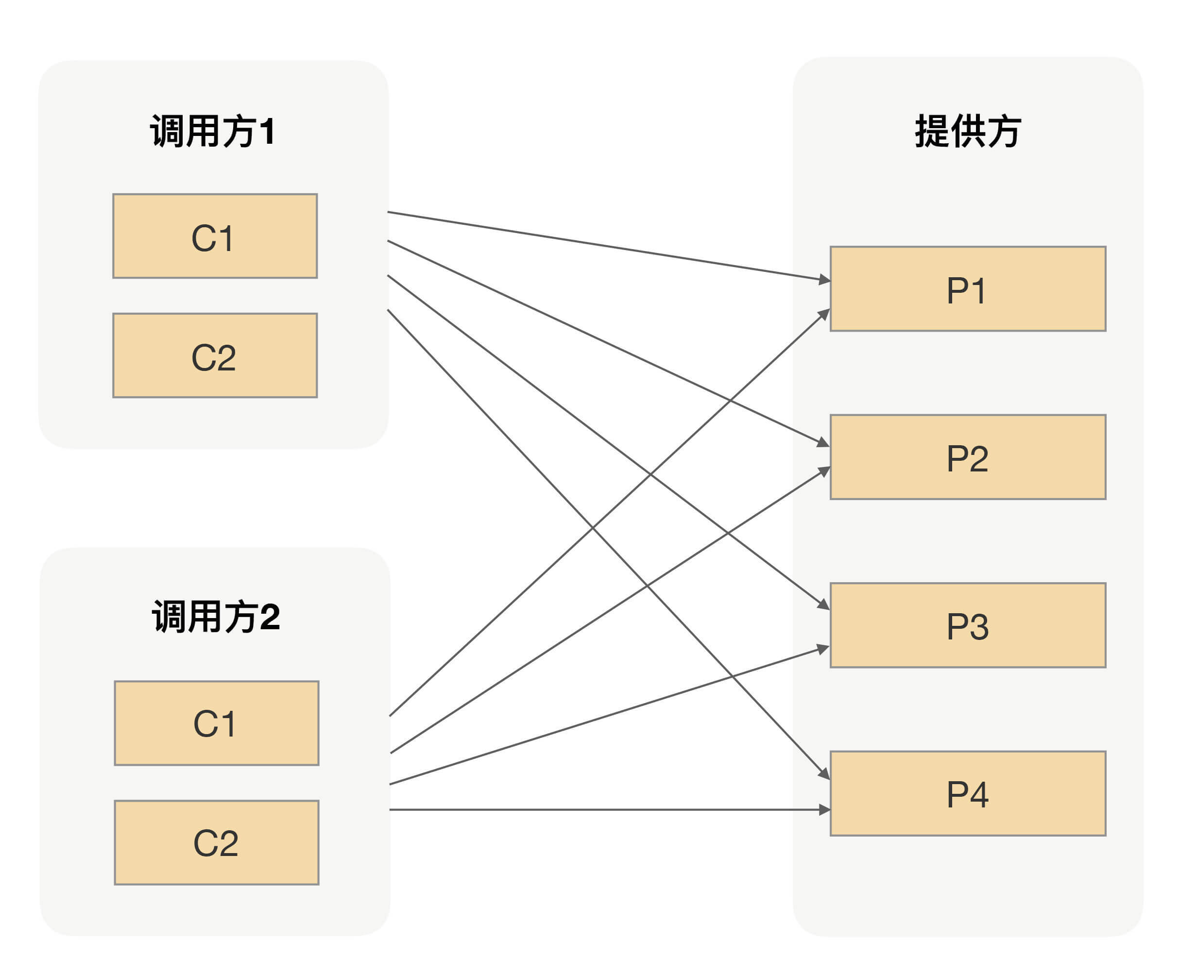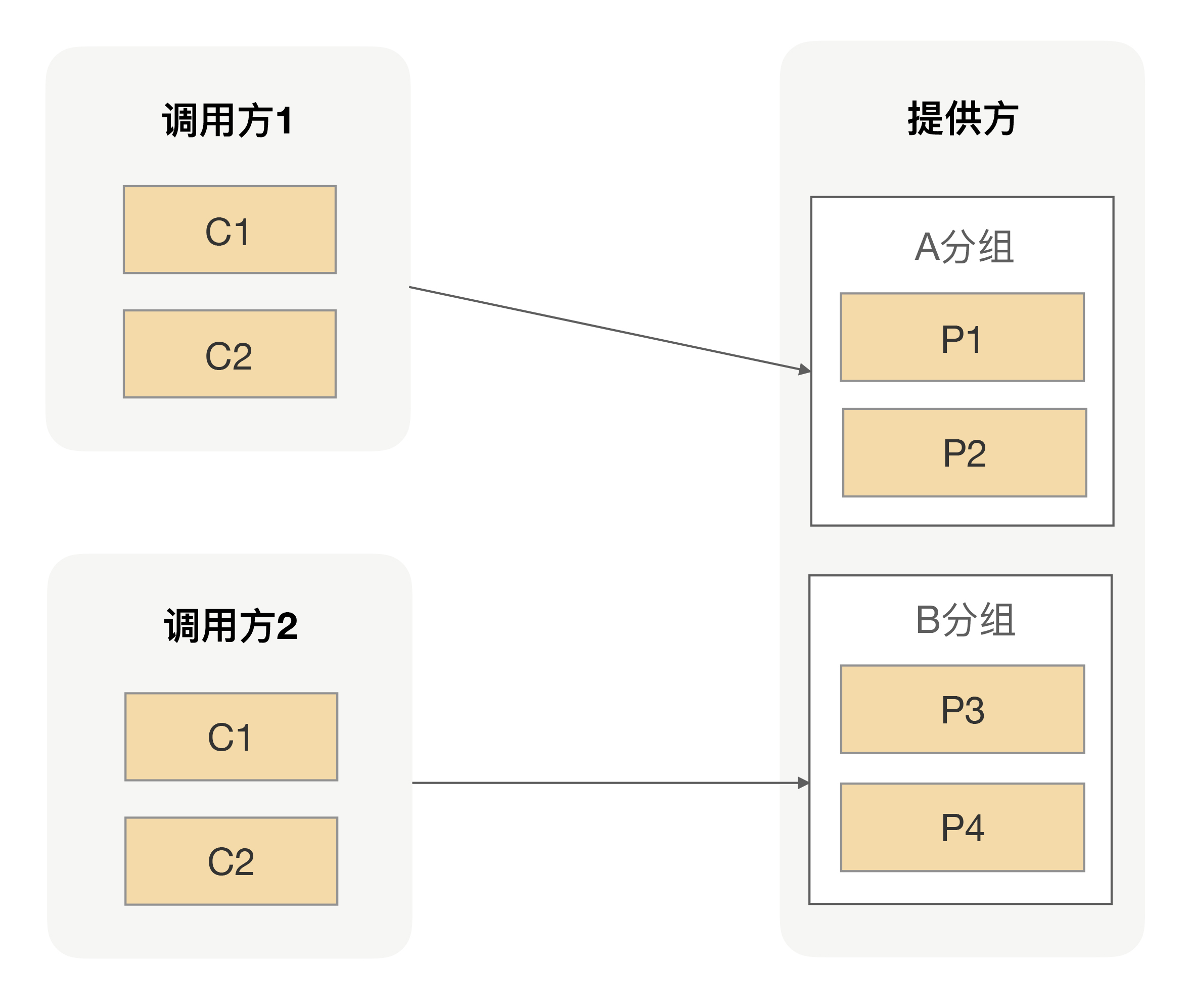 非核心应用不要跟核心应用分在同一个组,核心应用之间应该做好隔离,一个重要的原则就是保障核心应用不受影响。比如提供给电商下单过程中用的商品信息接口,我们肯定是需要独立出一个单独分组,避免受其它调用方污染的。有了分组之后,我们的服务调用方跟服务提供方之间的调用拓扑就如下图所示: