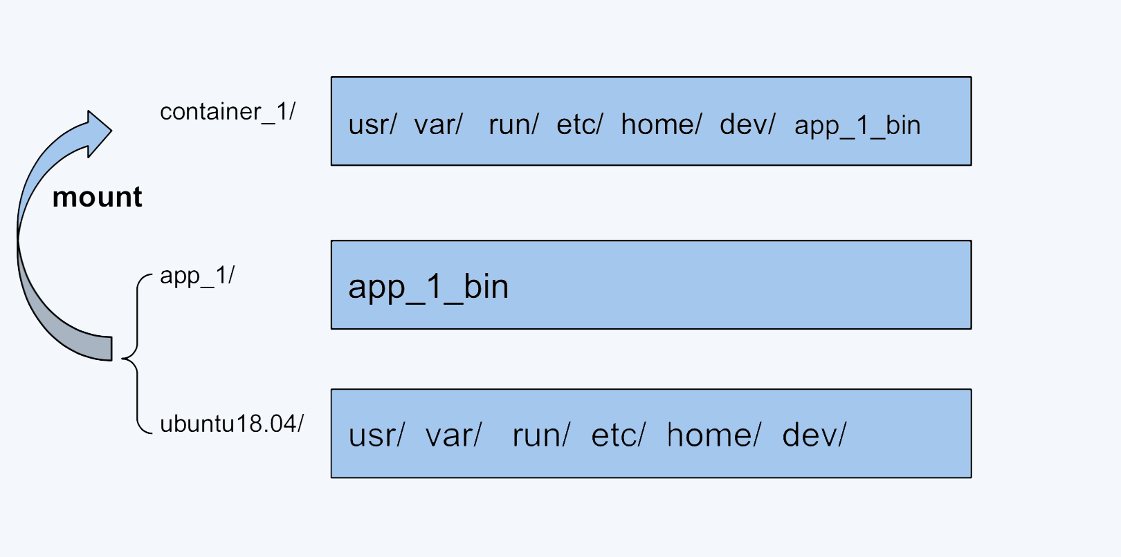 然后,我们把这两个目录挂载到container_1/这个目录下,作为容器1看到的文件系统;对于容器2,就可以把ubuntu18.04/和app_2/两个目录一起挂载到container_2的目录下。