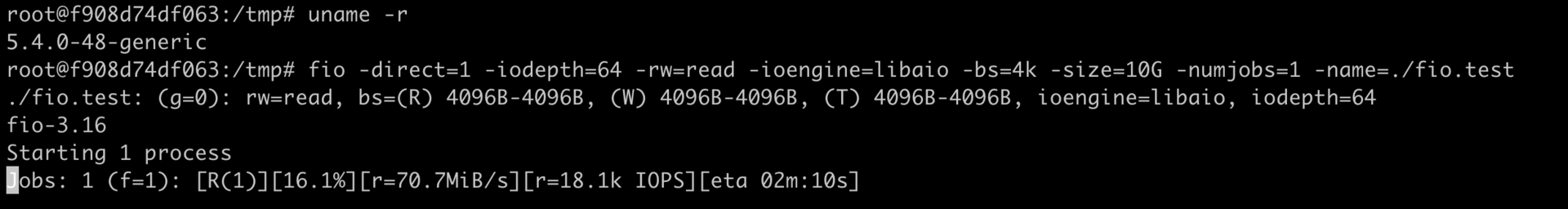我们可以先启动一个ubuntu18.04的虚拟机,它的Linux内核版本是4.15的,然后在虚拟机上用命令 docker run -it ubuntu:18.04 bash 启动一个容器,接着在容器里运行fio这条命令,看一下在容器中读取文件的性能。