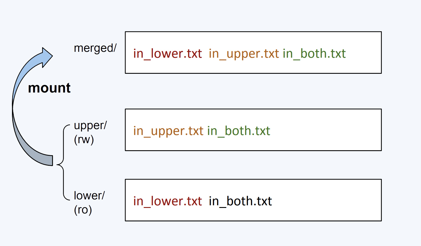 从挂载点的视角看,upper层的文件会覆盖lower层的文件,比如”in_both.txt”这个文件,在lower层和upper层都有,但是挂载点merged/里看到的只是upper层里的in_both.txt.