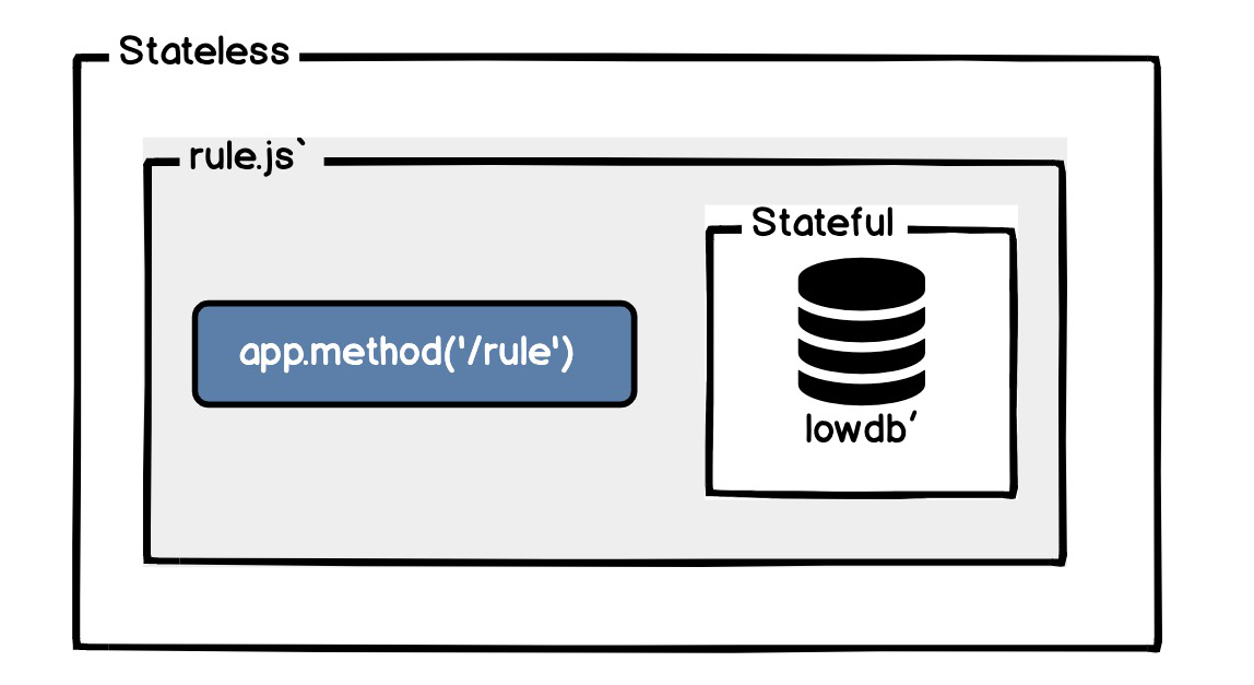 拿我们自己的例子来说也很简单,我们用消息队列RocketMQ,写操作我们都写入RocketMQ,rule.js进程中我们监听RocketMQ,一旦有rule写入的消息,我们就更新我们的lowdb数据。围绕消息队列建立的同步机制,让每个微服务的数据库和它的扩容副本之间自动同步了。对于微服务来说,它本身的数据库还是Stateful的,但在微服务外部看来,这个微服务是Stateless的。如下图所示: