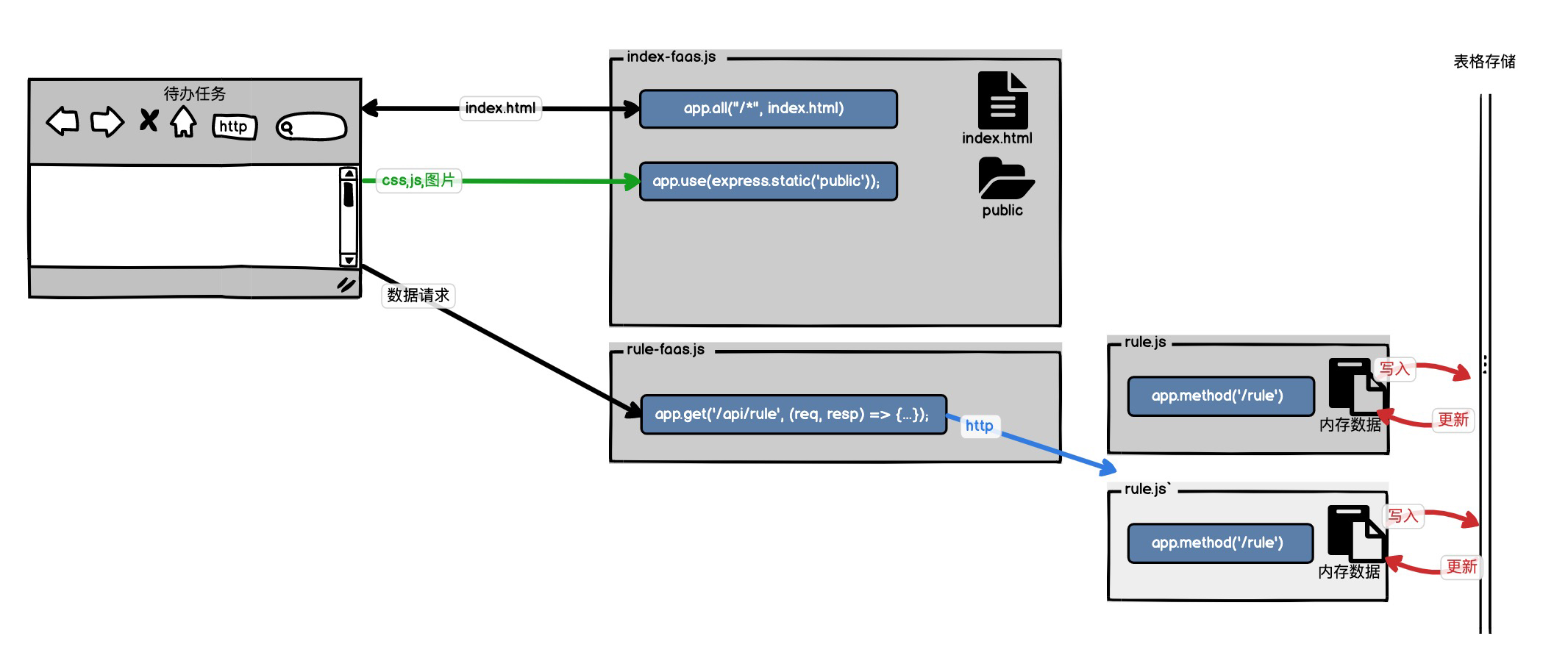 这次的部署会有些复杂,我们要部署两个FaaS服务,一个是rule-faas.js,用来处理/api/rule;另一个是index-faas.js,用来处理我们的静态资源请求。原理图如下所示:
