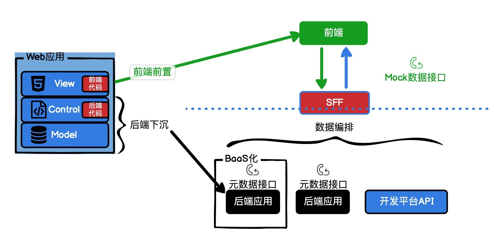 咱从左往右看上面这张图。用户从浏览器打开我们网站时,前端应用响应返回index.html;然后浏览器去CDN下载我们的静态资源,完成页面静态资源的加载;与此同时,浏览器也向前端应用发起数据请求;前端应用经过安全签名后,再将数据请求发送给SFF;SFF再根据数据请求,调用后端接口或服务,最终将结果编排后返回。