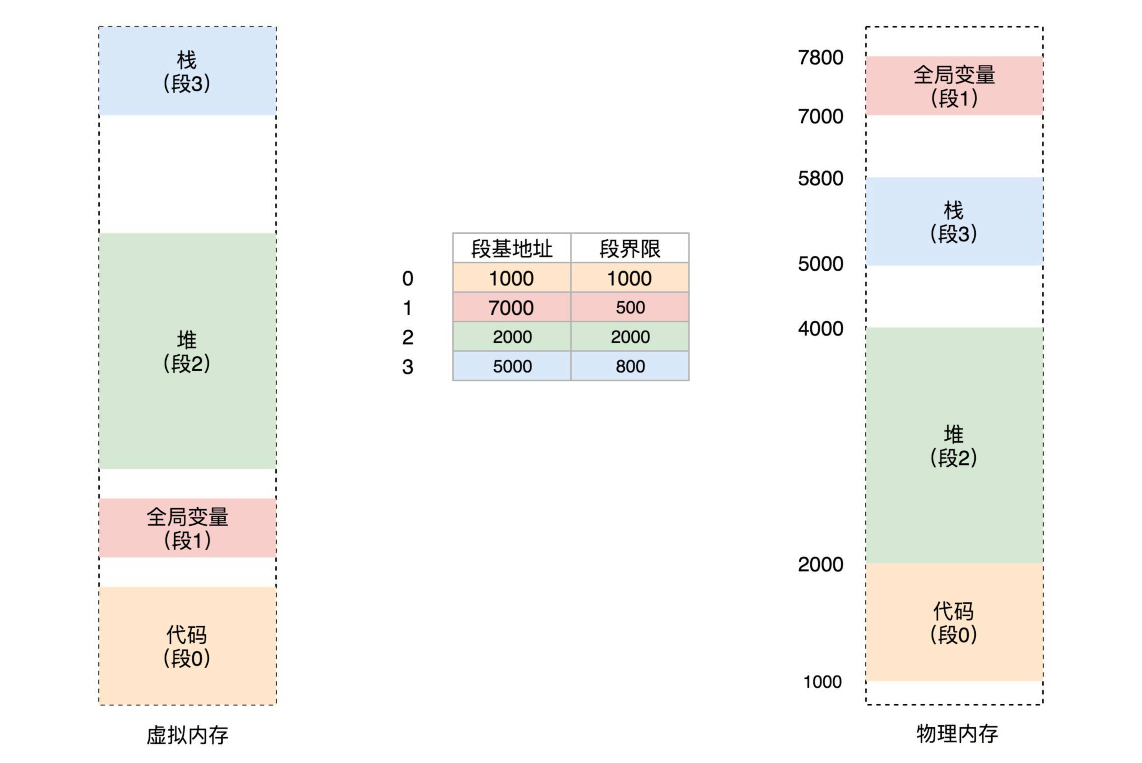 例如,我们将上面的虚拟空间分成以下4个段,用0~3来编号。每个段在段表中有一个项,在物理空间中,段的排列如下图的右边所示。