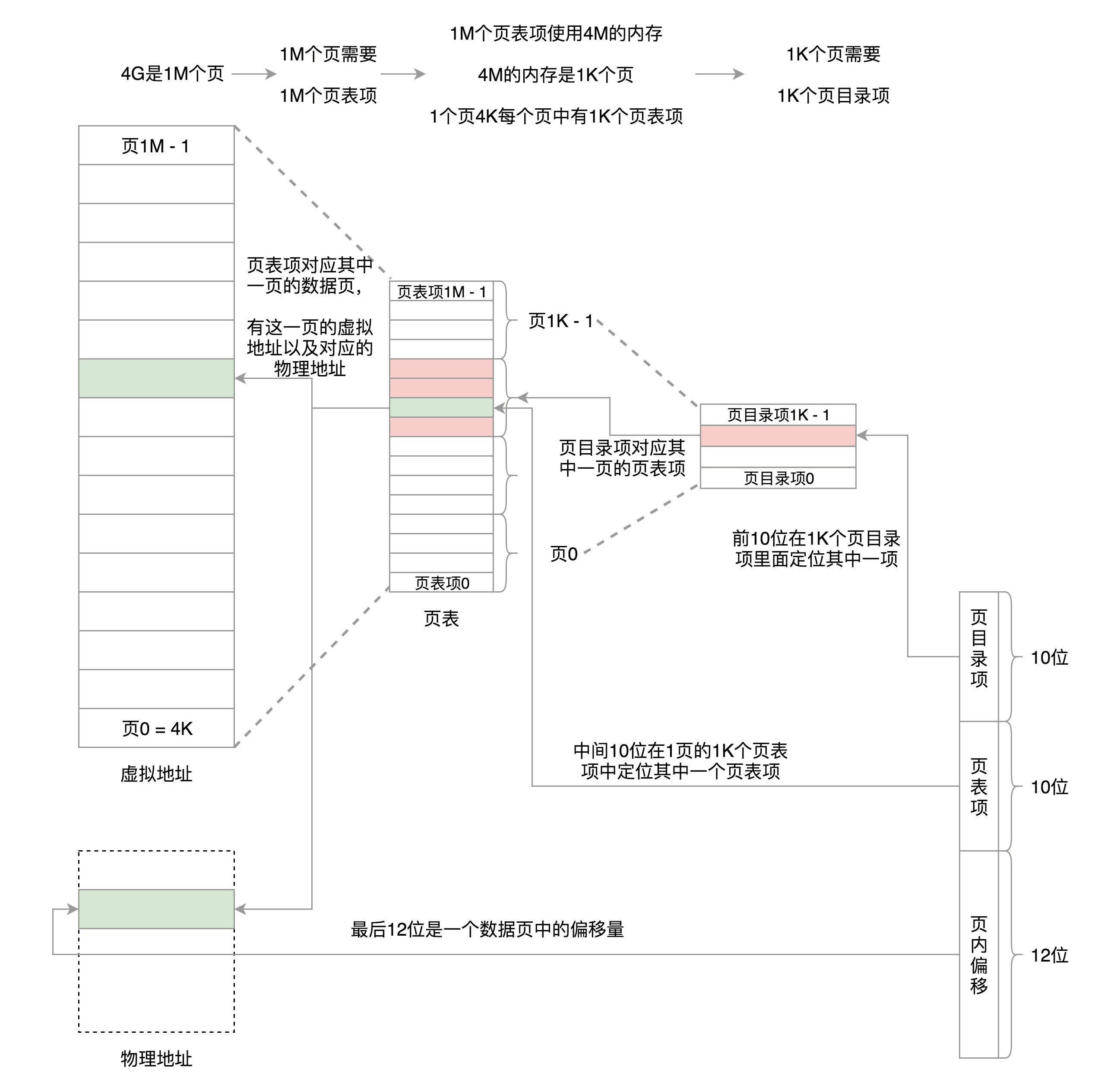 这样加起来正好32位,也就是用前10位定位到页目录表中的一项。将这一项对应的页表取出来共1k项,再用中间10位定位到页表中的一项,将这一项对应的存放数据的页取出来,再用最后12位定位到页中的具体位置访问数据。