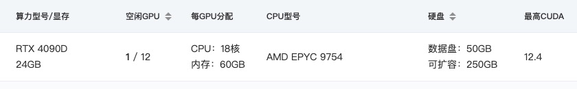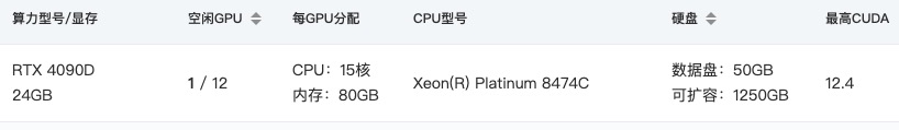 我选用的是AutoDL云计算环境。注意选用一个GPT-SoVITS的镜像创建主机,下面是我具体的主机配置。