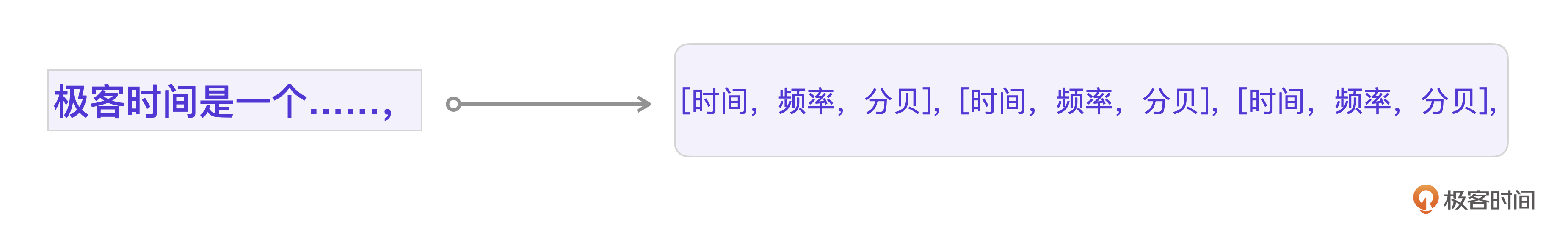 我们假设这个音频对应的文本是 极客时间是一个……。从频谱图上,能非常明显地看到时间线的一个颜色条对应一个中文字,不管音频的三个维度怎么表示,我们都可以把这个语音看做和文本一样的序列。