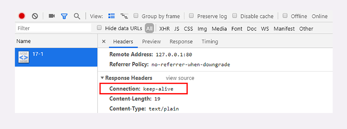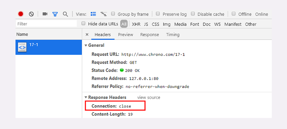 你可以在实验环境里访问URI“/17-1”,用Chrome看一下服务器返回的响应头: