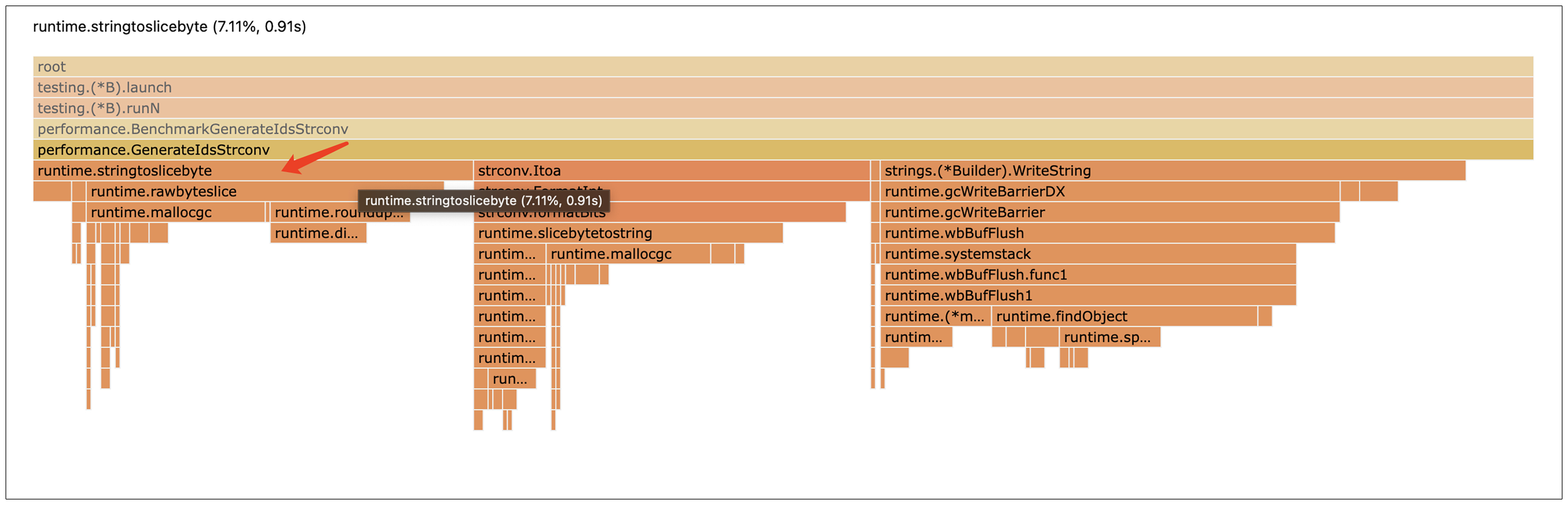 从火焰图中我们可以看到,用strconv库优化后,除了已经优化过的字符串拼接和整型转字符串操作,还有个runtime.stringtoslicebyte函数消耗CPU资源也比较多。