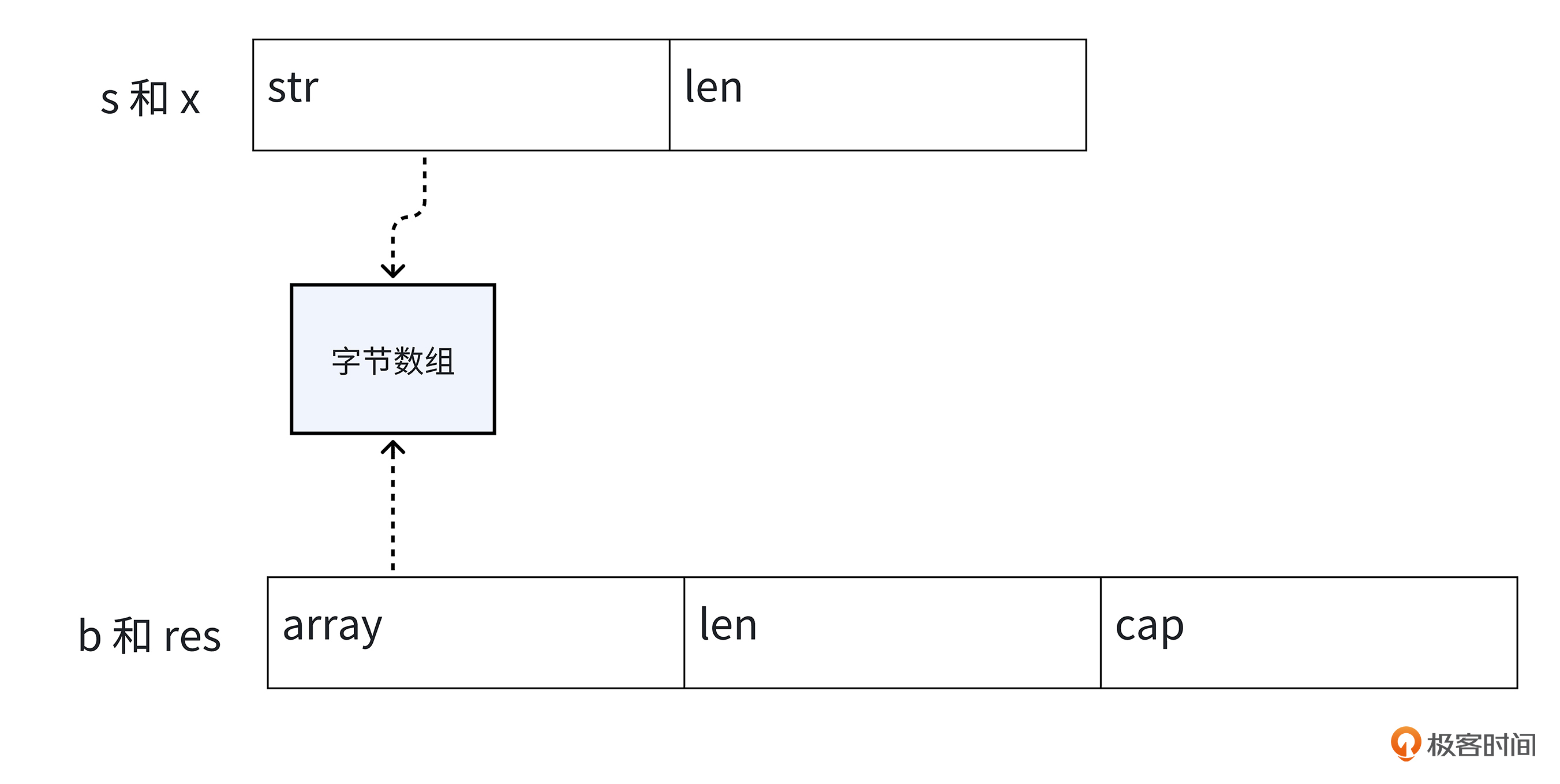 在搞明白runtime.stringtoslicebyte函数的实现逻辑之前,咱们先看看字符串和切片的数据结构。