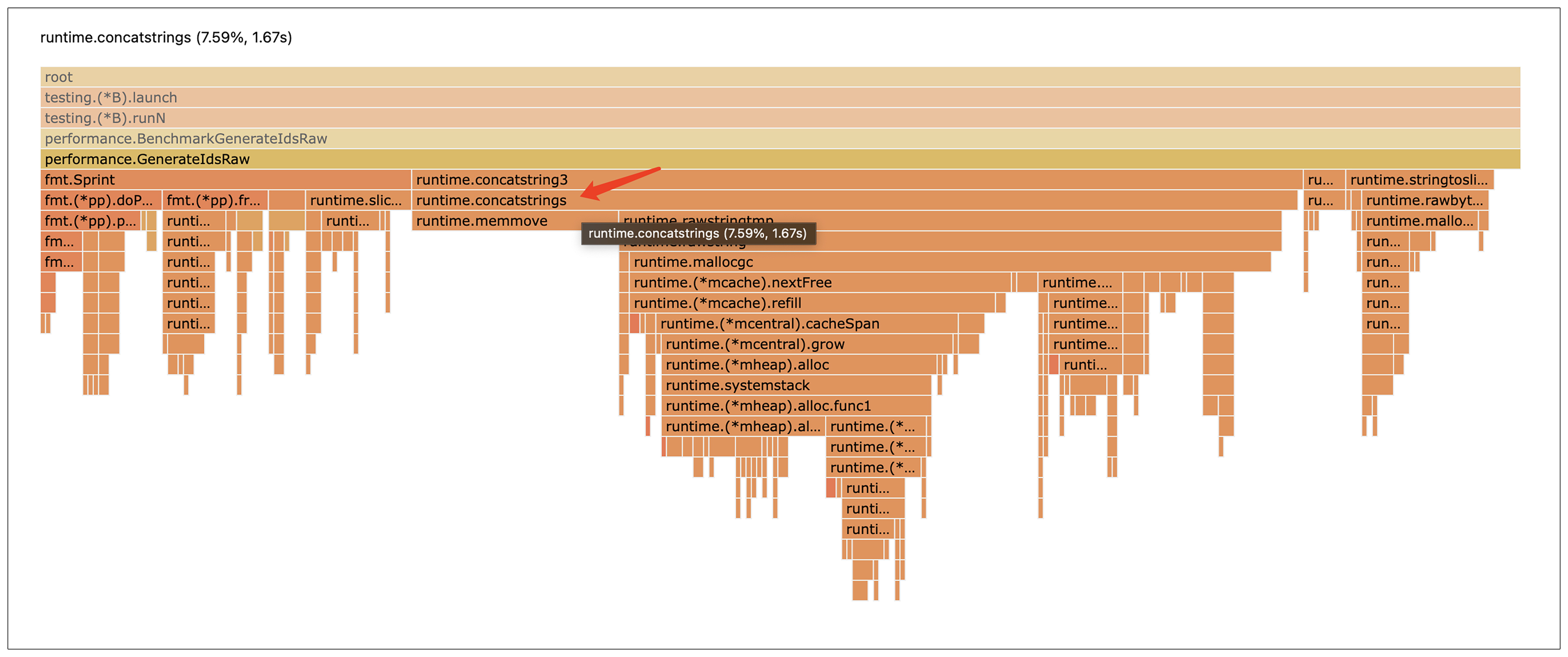 从火焰图中我们可以看到,消耗CPU最多的是runtime.concatstrings函数,而这个函数是Go语言 “+” 操作符进行字符串拼接的底层实现函数。