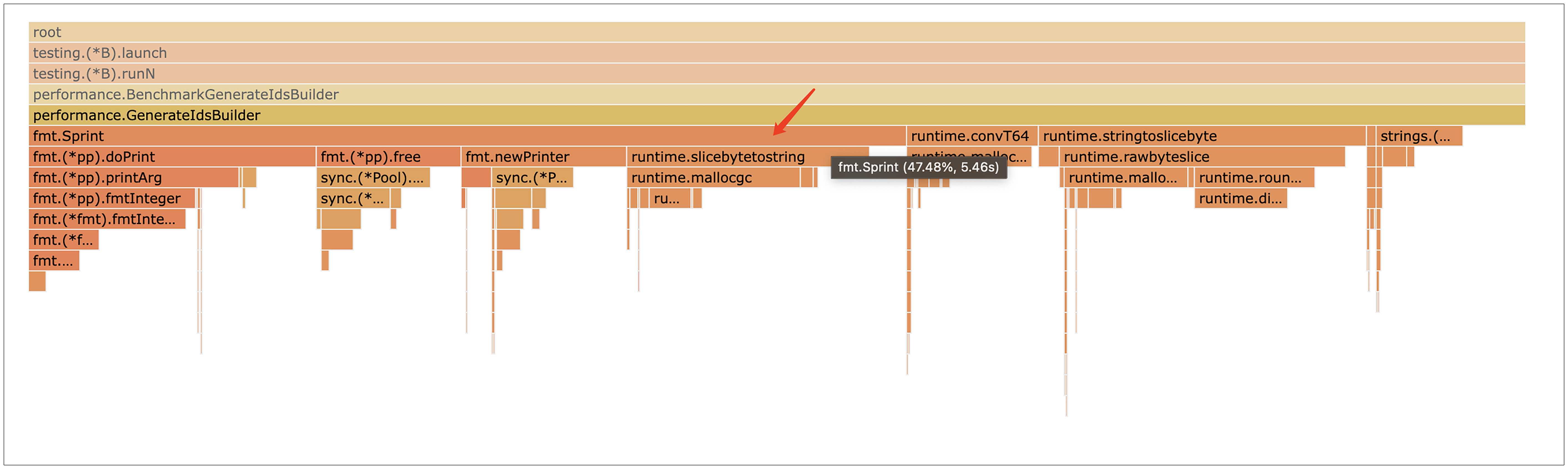 从火焰图中我们可以看到,用strings.Builder优化后,消耗CPU最多的函数变成了fmt.Sprint函数。
