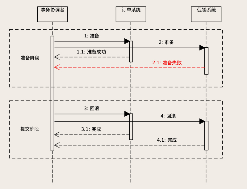 我们还是分两个阶段来说明。在准备阶段,如果任何一步出现错误或者是超时,协调者就会给两个系统发送“回滚事务”请求。每个系统在收到请求之后,回滚自己的数据库事务,分布式事务执行失败,两个系统的数据库事务都回滚了,相关的所有数据回滚到分布式事务执行之前的状态,就像这个分布式事务没有执行一样。以下是异常情况的时序图: