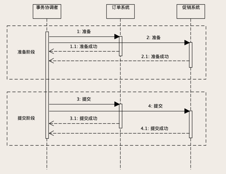 注意,到这里我们没有提交订单数据库的事务,最后给事务协调者返回“准备成功”。类似的,促销服务在准备阶段,需要在促销库开启一个数据库事务,更新优惠券状态,但是暂时不要提交这个数据库事务,给协调者返回“准备成功”。协调者在收到两个系统“准备成功”的响应之后,开始进入第二阶段。