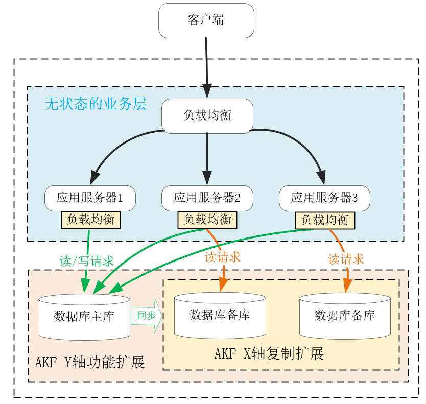 当然,AKF X轴扩展最大的问题是只能扩展无状态服务,当有状态的数据库出现性能瓶颈时,X轴是无能为力的。例如,当用户数据量持续增长,关系数据库中的表就会达到百万、千万行数据,SQL语句会越来越慢,这时可以沿着AKF Z轴去分库分表提升性能。又比如,当请求用户频率越来越高,那么可以把单实例数据库扩展为主备多实例,沿Y轴把读写功能分离提升性能。下面我们先来看AKF Y轴如何扩展系统。