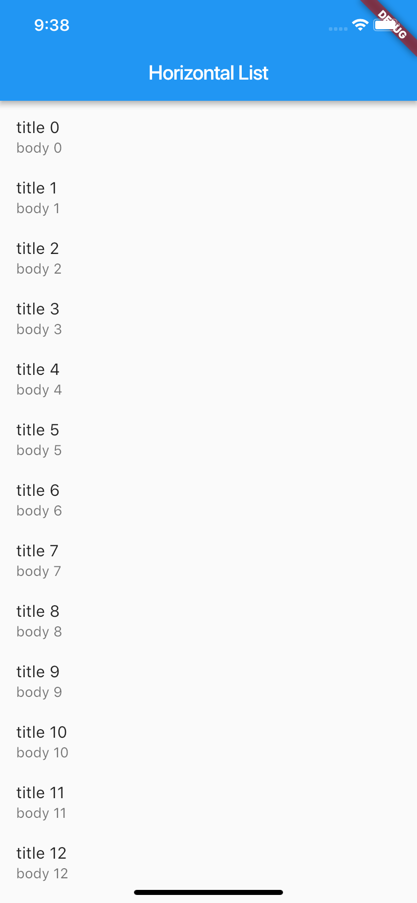 我定义了一个拥有100个列表元素的ListView,在列表项的创建方法中,分别将index的值设置为ListTile的标题与子标题。比如,第一行列表项会展示title 0 body 0: