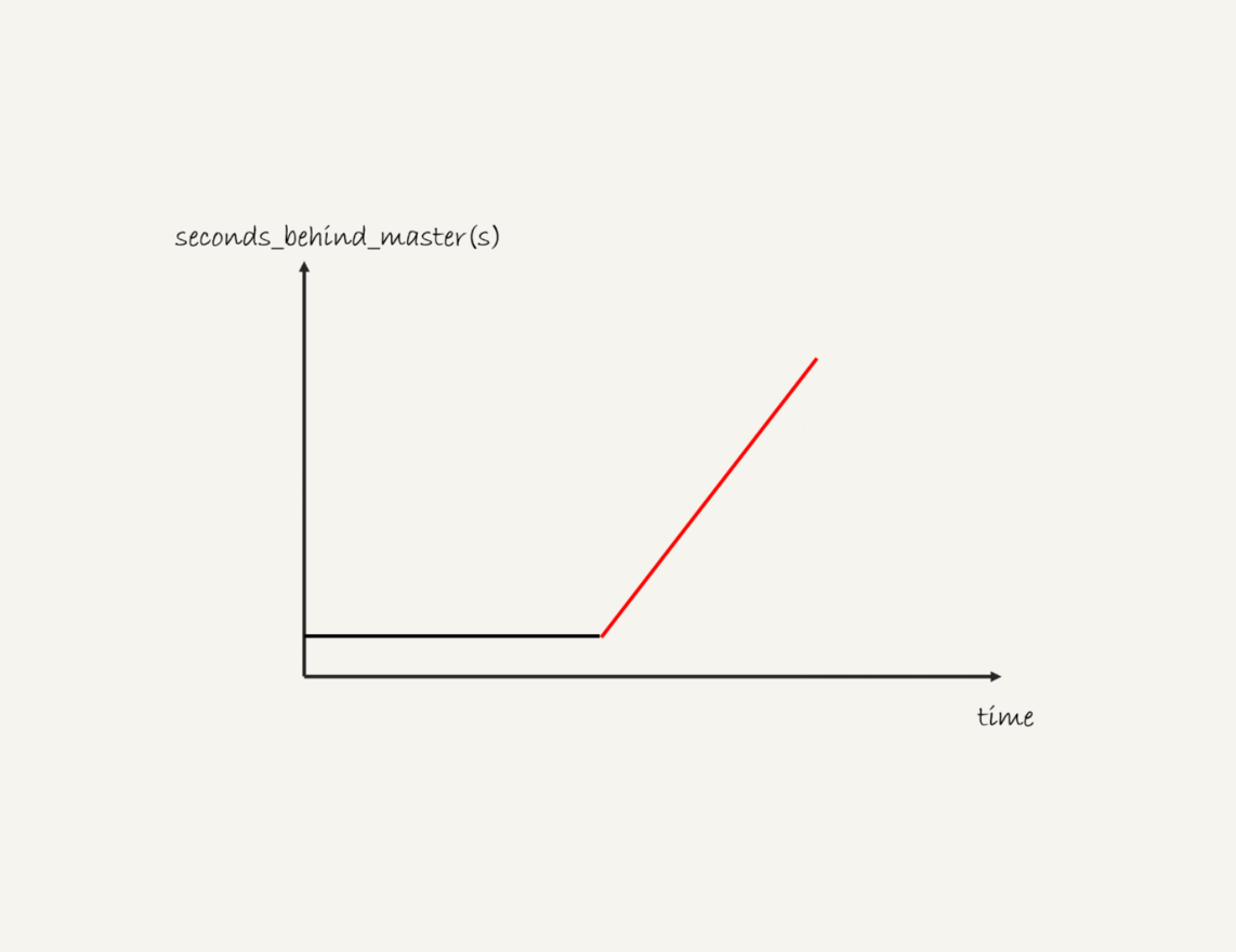 假设,现在你看到你维护的一个备库,它的延迟监控的图像类似图6,是一个45°斜向上的线段,你觉得可能是什么原因导致呢?你又会怎么去确认这个原因呢?