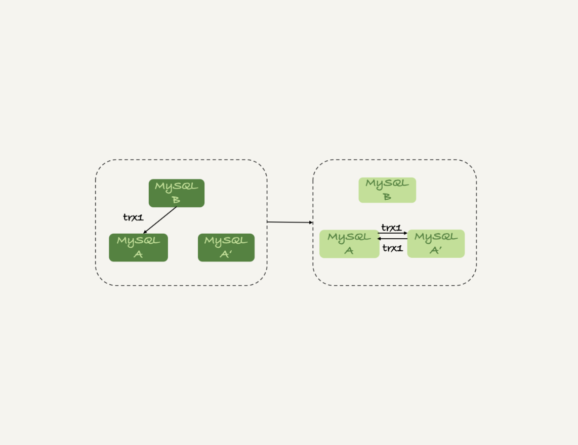 另一种场景是,有三个节点的时候,如图7所示,trx1是在节点 B执行的,因此binlog上的server_id就是B,binlog传给节点 A,然后A和A’搭建了双M结构,就会出现循环复制。