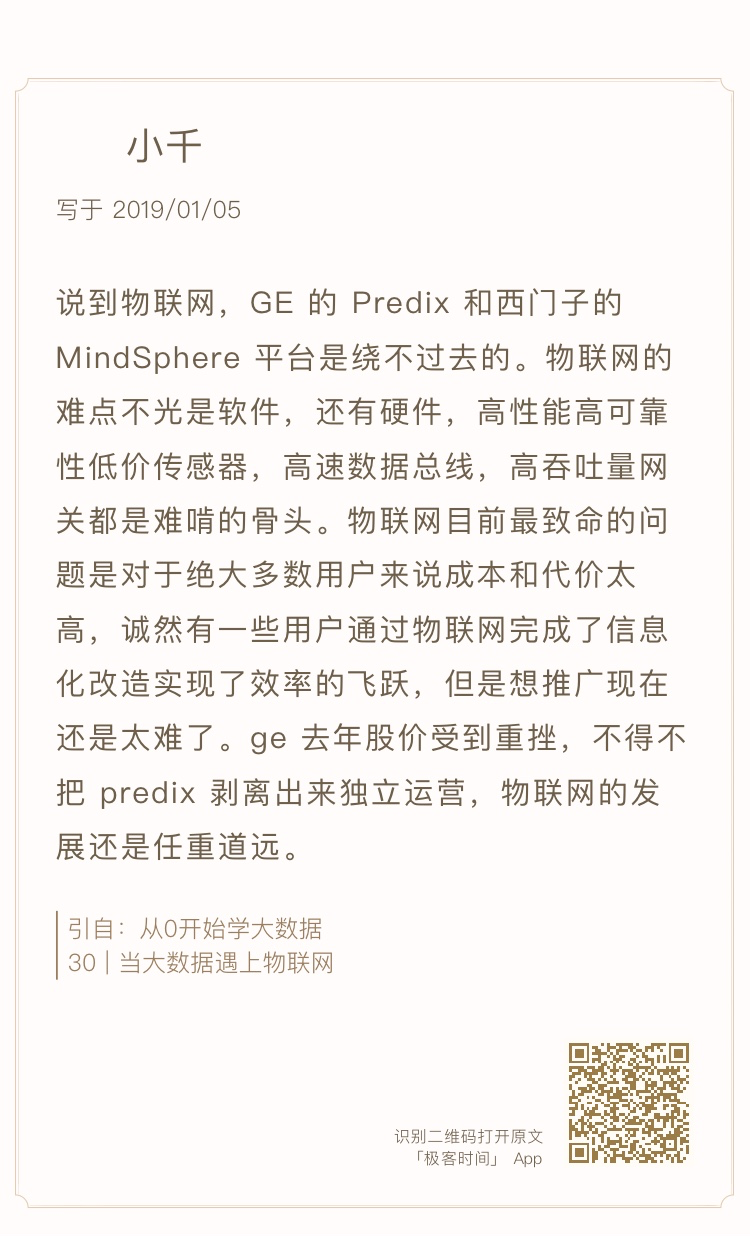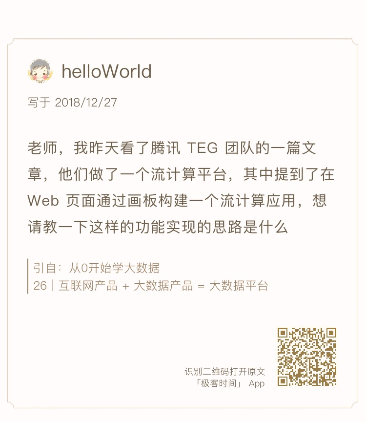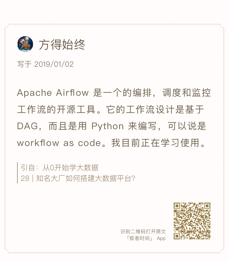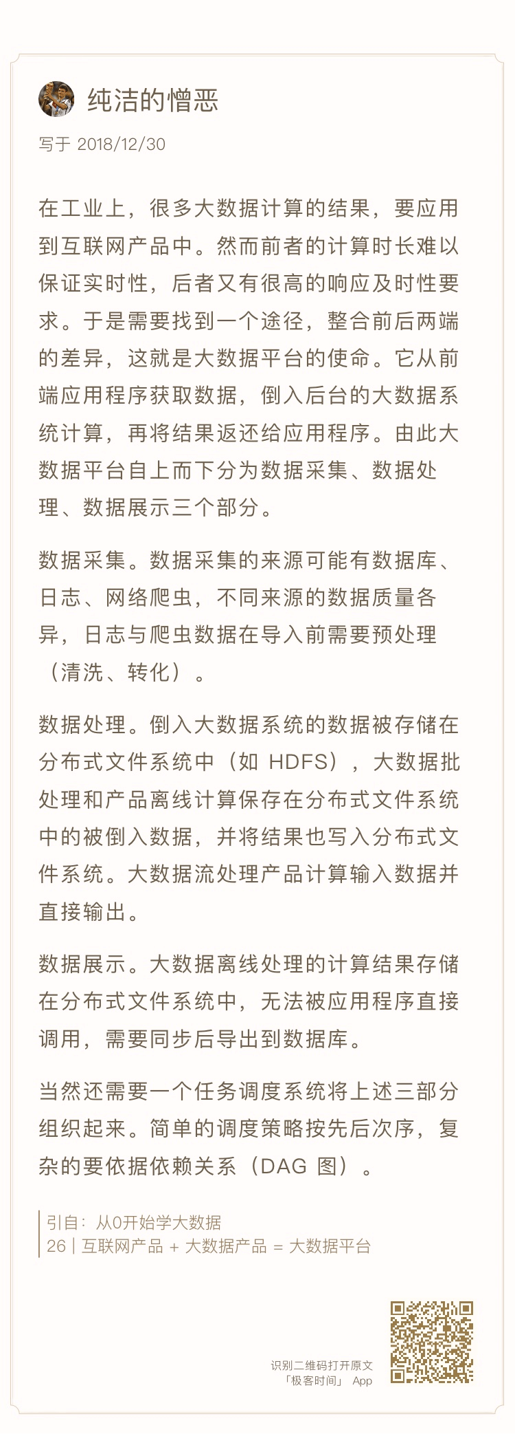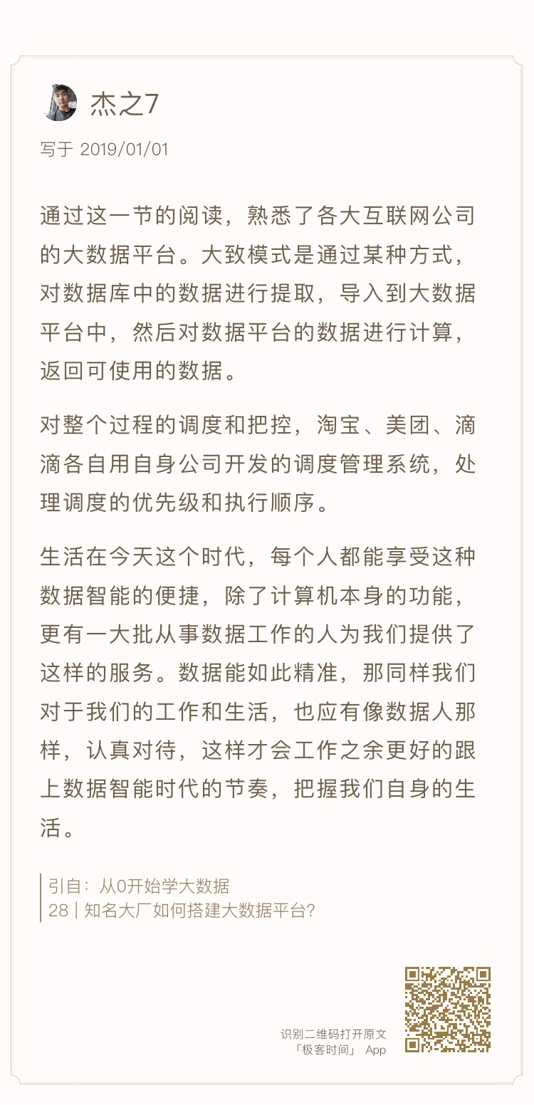 我的专栏的名字叫《从0开始学大数据》,确实不需要你有任何大数据背景就可以跟着专栏开始学习大数据,但是我并不希望你学完专栏后,还只是打了一个大数据的基础,我更希望你能掌握构建大数据系统大厦的能力。这当然会有难度,学习过程中也会有挫折感,但是我依然希望你能坚持学习,即使有些技术不能完全掌握,但是至少可以让你的视野达到一个更高的高度,去感受架构师如何思考架构设计,并可以把收获应用到未来的学习工作中,让自己有不断进步的目标和动力。