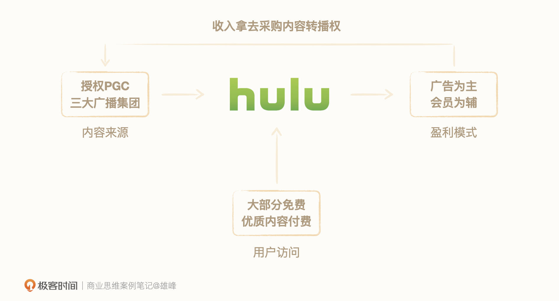 Hulu模式:PGC生产内容+广告为主&会员为辅。平台不生产内容,内容全部由专业机构生产,这种内容生产模式叫PGC(专业生产内容)。平台的盈利来自广告费+会员费,大部分内容都可以免费观看,但需要看一定时间的广告。部分高清视频以及独播内容则需要会员付费。平台为了获得正版授权的内容,都会花大价钱去采购内容,做内容的二次分销。
