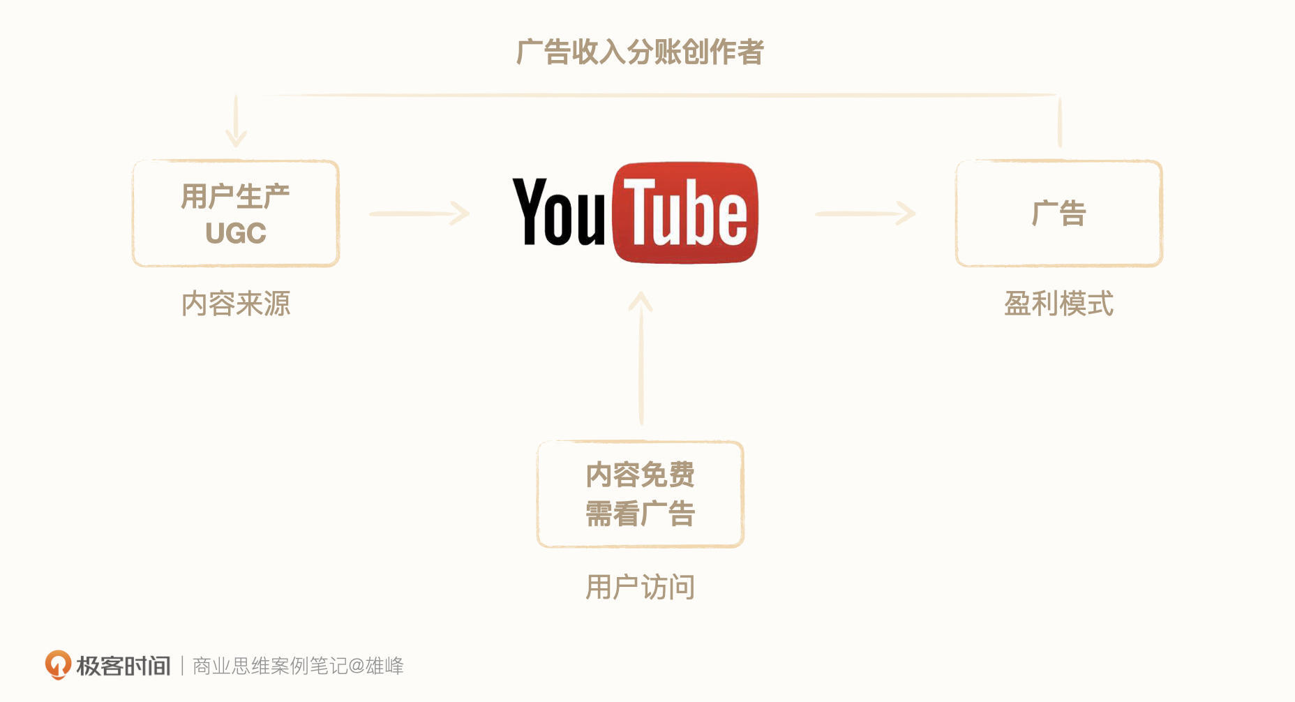 YouTube模式:UGC生产内容+广告收入。平台不生产内容,内容全部由用户生产,这种内容生产模式叫做UGC(用户生产内容)。平台的盈利来自广告费,用户可以免费观看所有内容,但需要看一定的广告。为了更好地鼓励用户生产内容,平台会根据视频产生的广告收入分一部分给创作者。