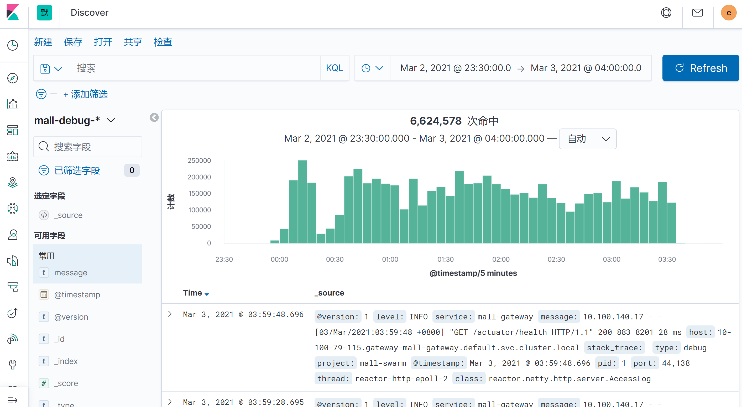 - 配置好ELFK后,在Kibana的Discover界面就能看到收集的信息。注意,一条日志对应的就是一次命中。