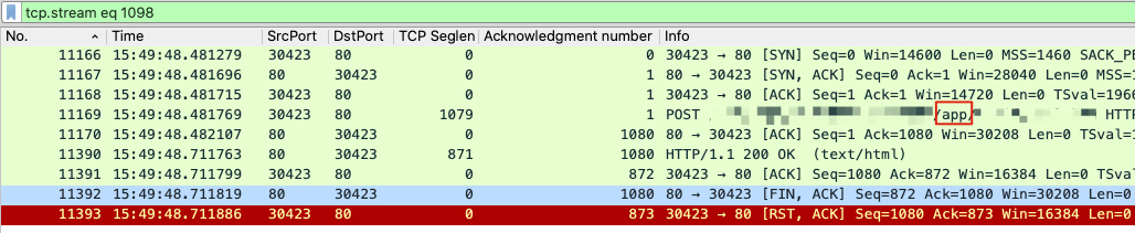 接下来要做的事情就会简单很多:只要把这三个RST所在的TCP流里的应用层数据(也就是HTTP请求和返回)跟Nginx日志中的请求和返回进行对比,就能找到是哪个RST引起了Nginx报错了。