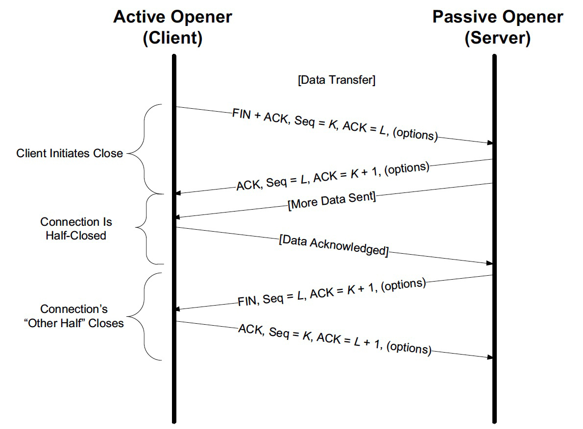 - 一端(A)发送FIN,表示“我要关闭,不再发送新的数据了,但我可以接收新的数据”。