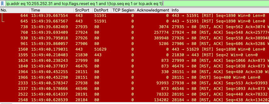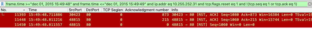 1 | frame.time >="dec 01, 2015 15:49:48" and frame.time <="dec 01, 2015 15:49:49" and ip.addr eq 10.255.252.31 and tcp.flags.reset eq 1 and !(tcp.seq eq 1 or tcp.ack eq 1) |