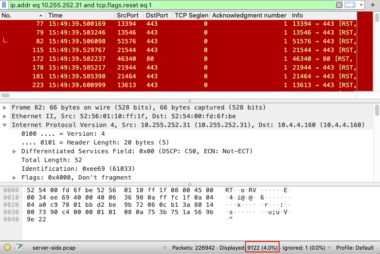 在Wirershark窗口的右下角,就有符合过滤条件的报文个数,这里有9122个,占所有报文的4%,确实是非常多。由此推测,日志里的很多报错估计应该就是其中一些RST引起的。我们选一个先看一下。