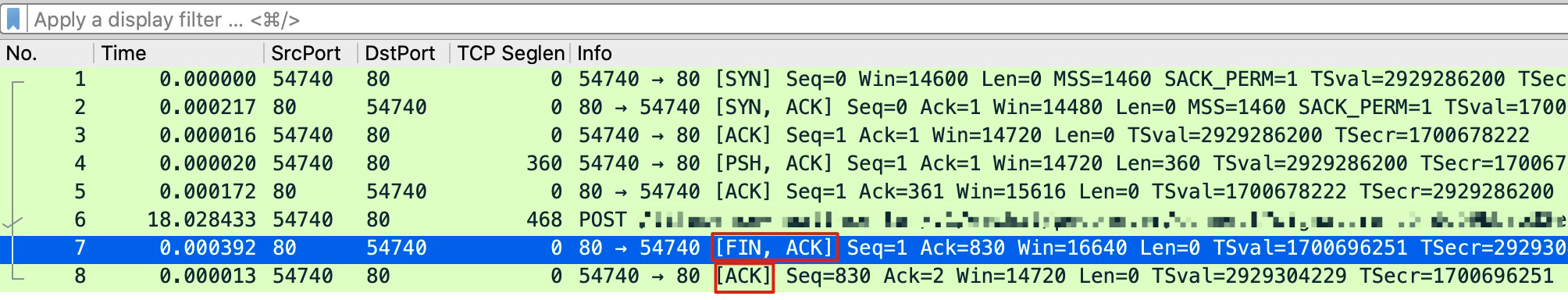 原来,第一个FIN控制报文,并没有像常规的那样单独出现,而是合并(Piggybacking)在POST报文里!所以,整个挥手过程,其实依然十分标准,完全遵循了协议规范。仅仅是因为Wireshark的显示问题,带来了一场小小的误会。虽然还有一个“为什么没有HTTP响应报文”的问题,但是TCP挥手方面的问题,已经得到了合理的解释了。