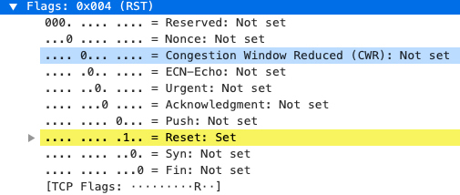 不过,这还只是第一个过滤条件,仅通过它过滤的话,出来的报文数量仍然比我们真正关心的报文要多很多。我们还需要第二个过滤条件,也就是要找到TCP RST报文。这就要用到另外一类过滤器了,也就是tcp.flags,而这里的flags,就是SYN、ACK、FIN、PSH、RST等TCP标志位。