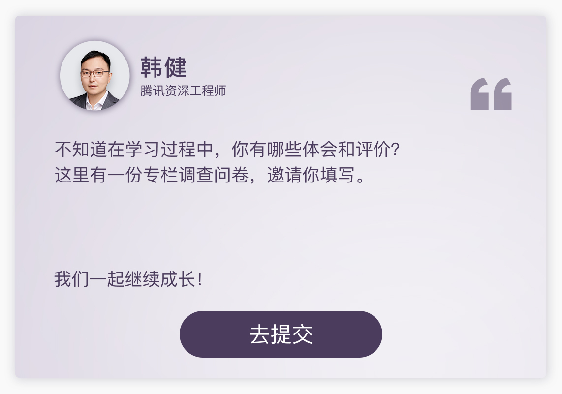 在文章结尾,我为你准备了一份调查问卷,题目不多,希望你能抽出两三分钟填写一下。我非常希望听听你对这个专栏的意见和建议,期待你的反馈!