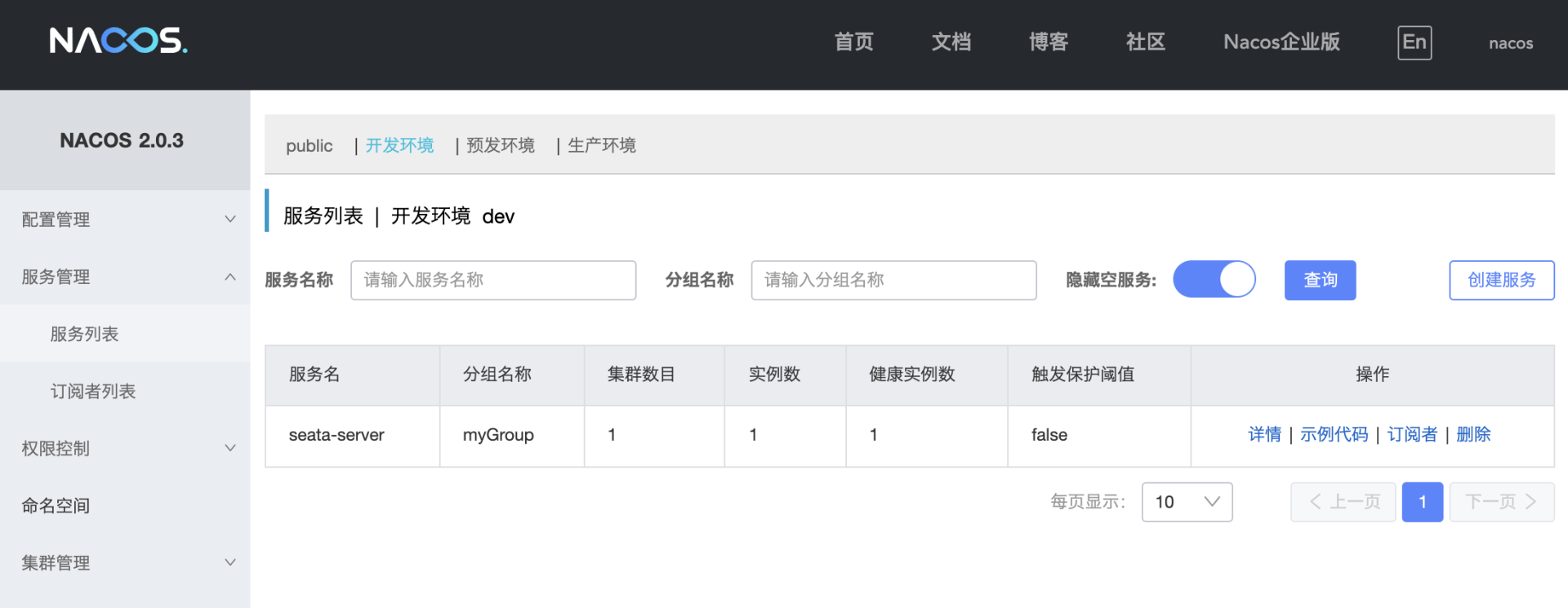 Seata Server启动完成之后,我们再顺带验证一把Seata到Nacos的注册流程是否完成。我们打开Nacos的服务列表页,切换到dev命名空间下,正常情况下你会看到一个名为seata-server的服务,分组是myGroup。