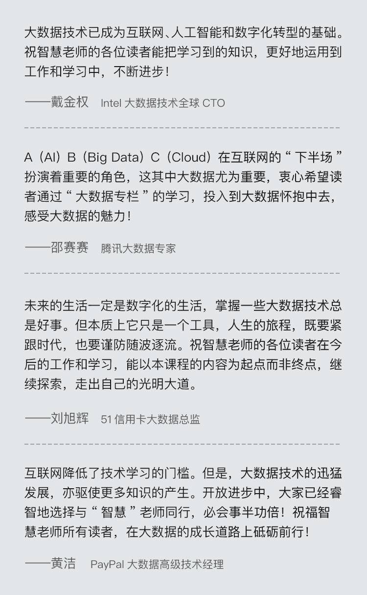 各位同学新年好,我是“大数据”专栏编辑Shawn,恭喜你完成了专栏的学习。下面是几位大数据领域的资深专家为你发来的寄语。专栏为你打开了一扇大门,门里的世界仍需努力去探索,智慧老师也会一直在这里为你答疑解惑,也愿你可以勇往直前,拥抱未来无限的可能。