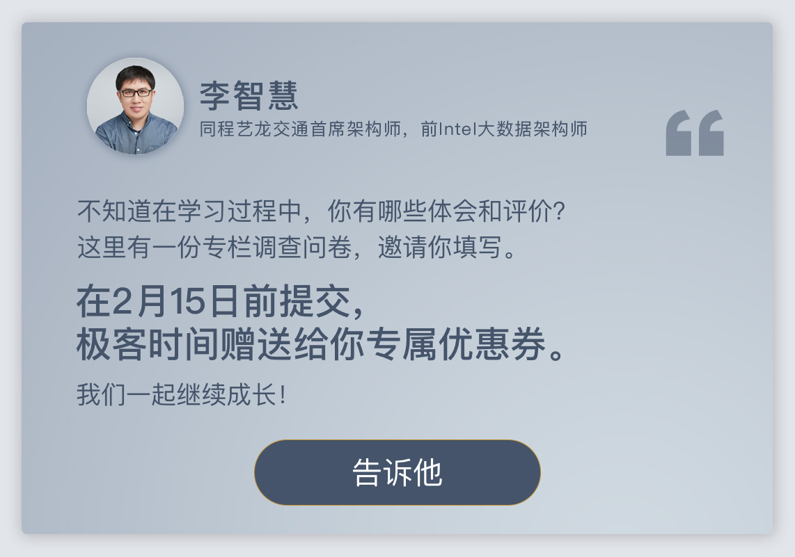 你好,我是李智慧。我的专栏《从0开始学大数据》到今天就全部结束了,42期专栏,我们一起走过3个月的时间,系统学习了Hadoop大数据系统的原理与架构;Hive、Spark、HBase等大数据生态下主要产品的原理和应用;学习了自己开发一个大数据SQL引擎的思路与方法,以及Spark源代码性能测试与优化等大数据开发实践;一起走进大数据技术背后的应用,也领略了大数据算法的魅力。