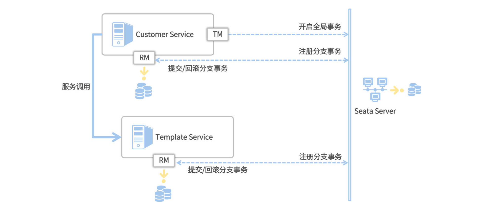 接下来,Template服务调用成功,Customer服务开始执行自己的本地事务,流程都大同小异就不说了。TM端根据业务的执行情况,最终做出二阶段决议,Commit或Rollback。
