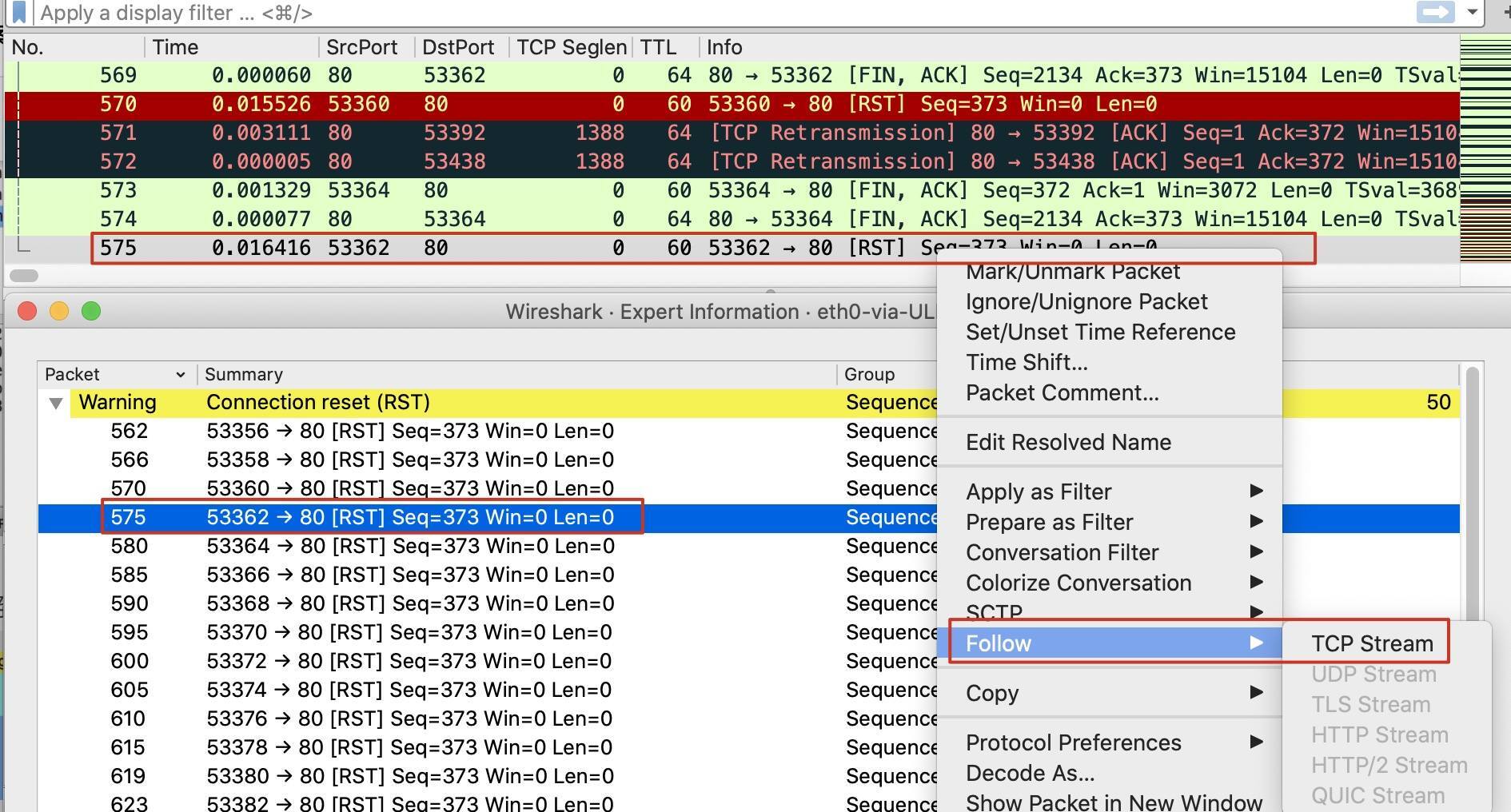 我们展开Warning Connection reset (RST),选一个报文然后找到它的TCP流来看一下: