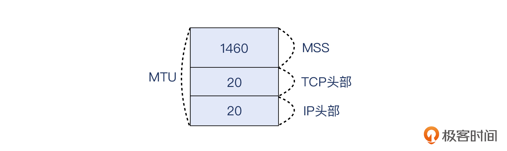 MTU本身是三层的概念,而在第四层的TCP层面,有个对应的概念叫MSS,Maximum Segment Size(最大分段尺寸),也就是单纯的TCP载荷的最大尺寸。MTU是三层报文的大小,在MTU的基础上刨去IP头部20字节和TCP头部20字节,就得到了最常见的MSS 1460字节。如果你之前对MTU和MSS还分不清楚的话,现在应该能搞清楚了。